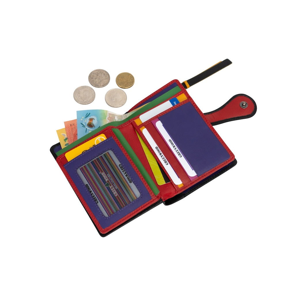 Fall in love with every detail of the Hearts Delight women’s wallet by Greenwood Leather. Handcrafted from genuine leather and adorned with vibrant heart appliqués, this chic and playful design brings a pop of colour to your everyday essentials. Compact yet cleverly organized, it’s perfect for carrying your cards, coins, and cash securely in style.